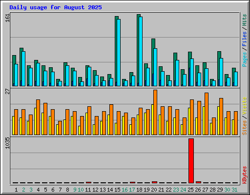| Day | Hits | Files | Pages | Visits | Sites | KBytes | ||||||